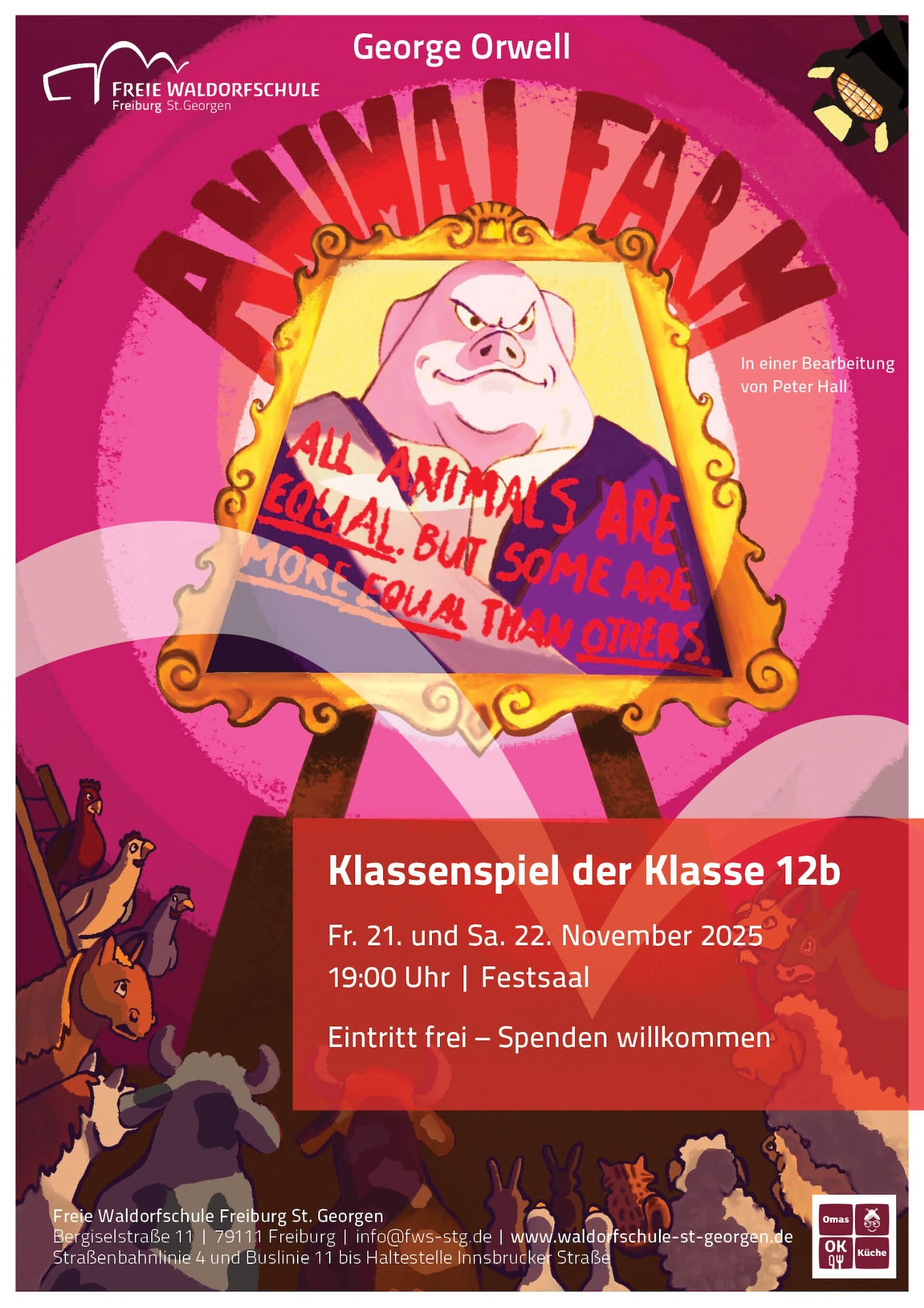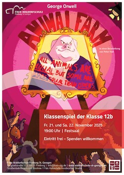 Die Klasse 12b lädt Sie herzlich zu ihrem Klassenspiel "Animal Farm" von George Orwell - in einer Bearbeitung von Peter Hall - ein. Am Freitag, den 21. und Samstag, den 22. November 2025, jeweils um 19:00 Uhr im Festsaal der Schule.