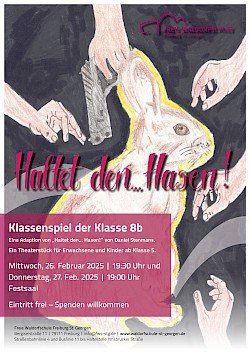 Die Klasse 8b lädt Sie herzlich zu Ihrem Klassenspiel ein. Ein Theaterstück für Erwachsene und Kinder ab der 5. Klasse. Eine Adaption von „Haltet den… Hasen!“ von Daniel Stenmans.